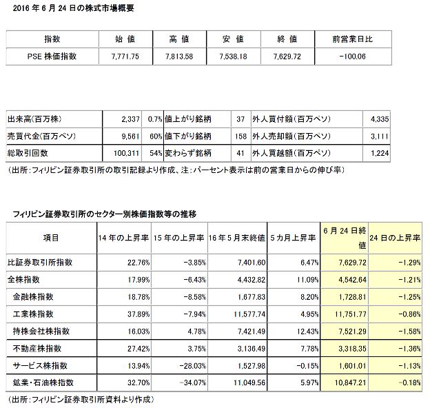 しかし、その後は英国のEU離脱の可能性が強まったことで反落に転じ、離脱が確定した後場では急落、PSE株価指数終値は前営業日比100.06ポイント安の7,629.72ポイントと7,700ポイント台割れとなった。この日の高値からは184ポイントの下落であり、英国のEU離脱問題に大きく左右された一日であった。ただ、下落率は1.29%と世界の他市場とくらべかなり軽微であり、この日の安値からは約91ポイント反発して引けており、この日に限れば、フィリピン株式市場は相対的に底堅かったといえる。個別では、国際金価格が急騰したことで、金鉱株が強い動きを見せた。
