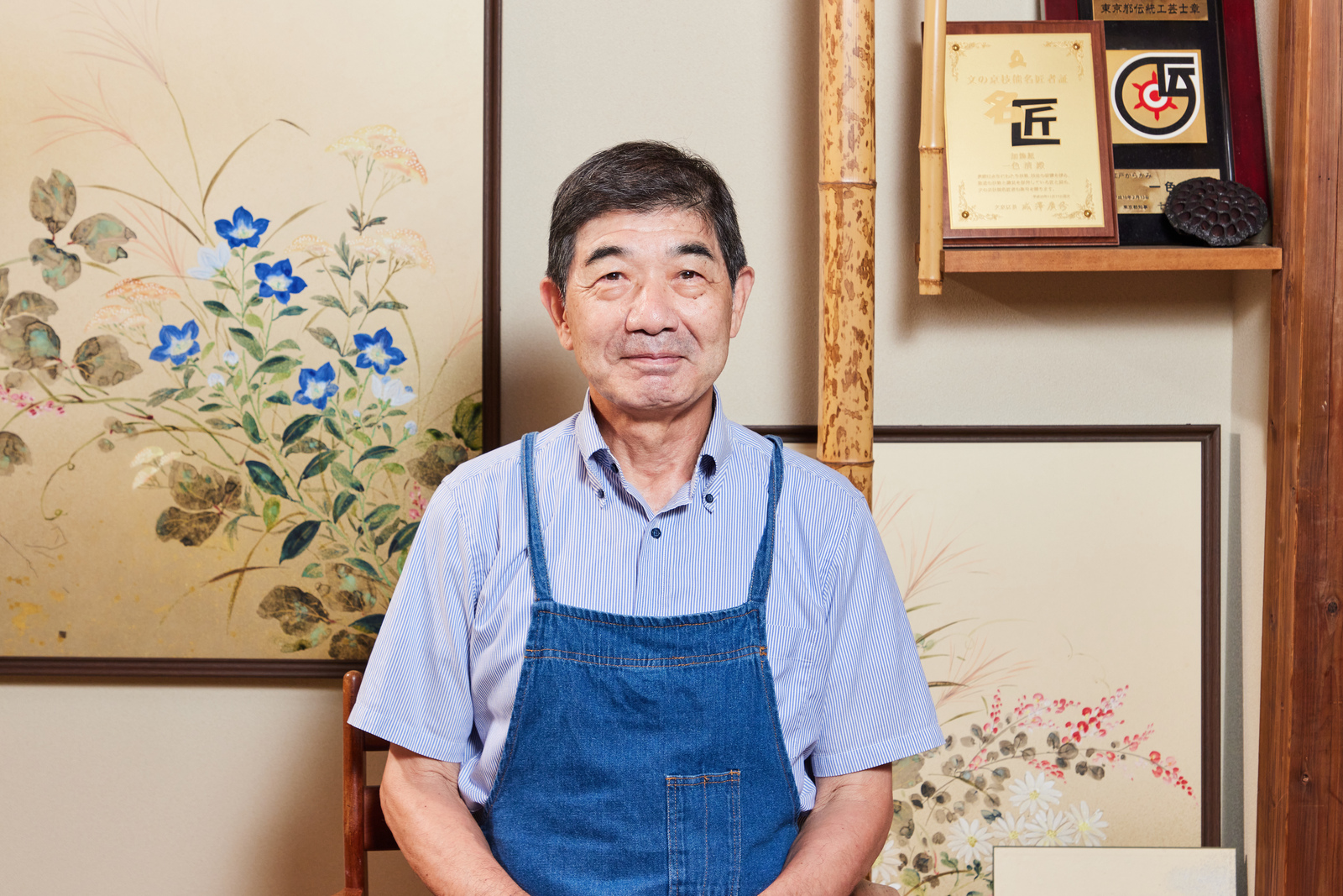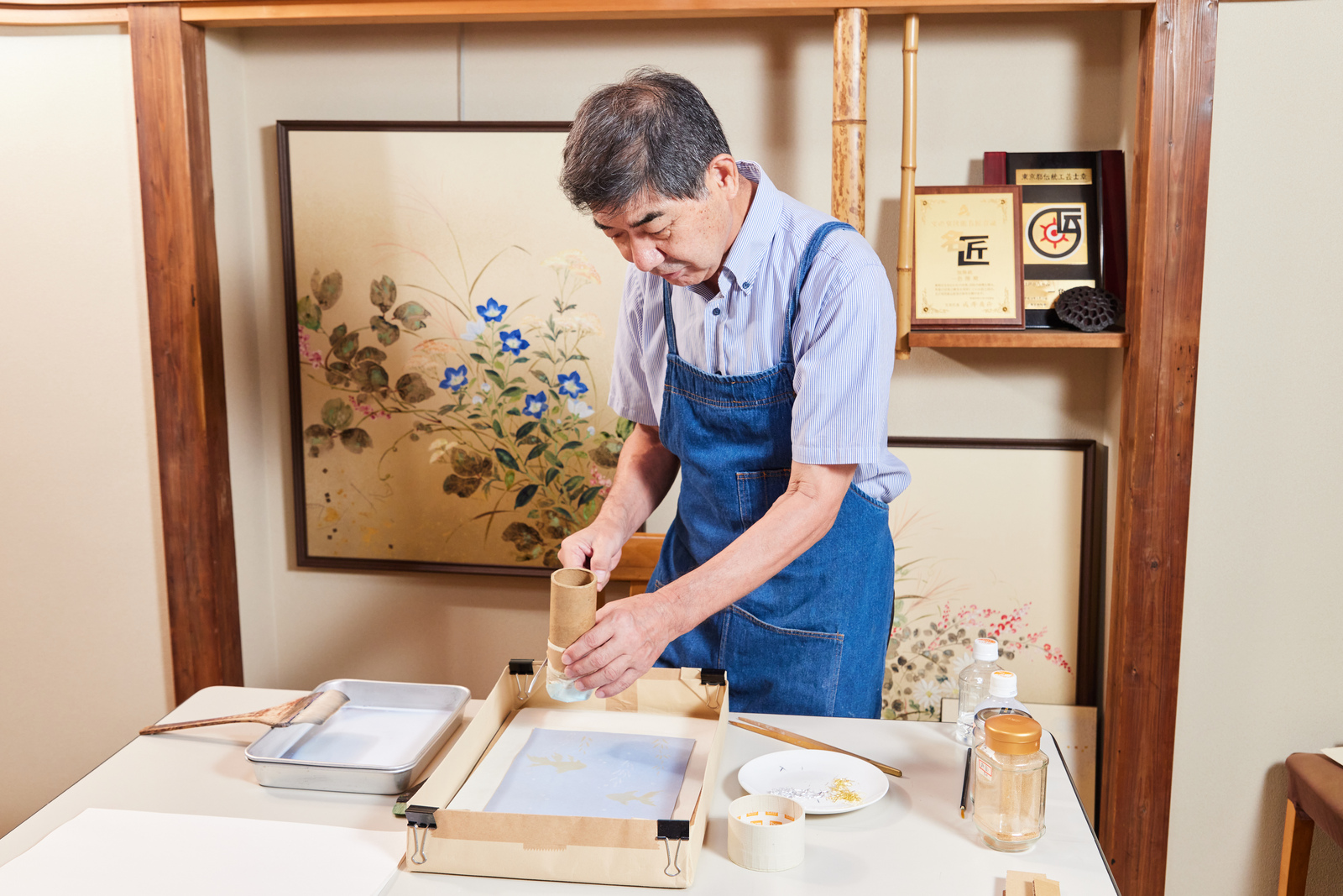 Founded in 1897 in Yushima, Bunkyo-ku, Tokyo. It carries on traditional decoration techniques, such as finely crushing and sprinkling gold and silver leaf to make Gold and Silver Leaf Powder Paper and using a brush to spread a crushed and mixed liquid blend of gold and silver leaf to make Deibiki Paper. Drawing on the tradition of his predecessors who crafted Karakami paper decorations, Kiyosi Issiki, the current third-generation master, has expanded into creating numerous contemporary items adorned with powder, including decorative accessories and wall hangings. While respecting traditional techniques, he continues to pursue new forms of expression.