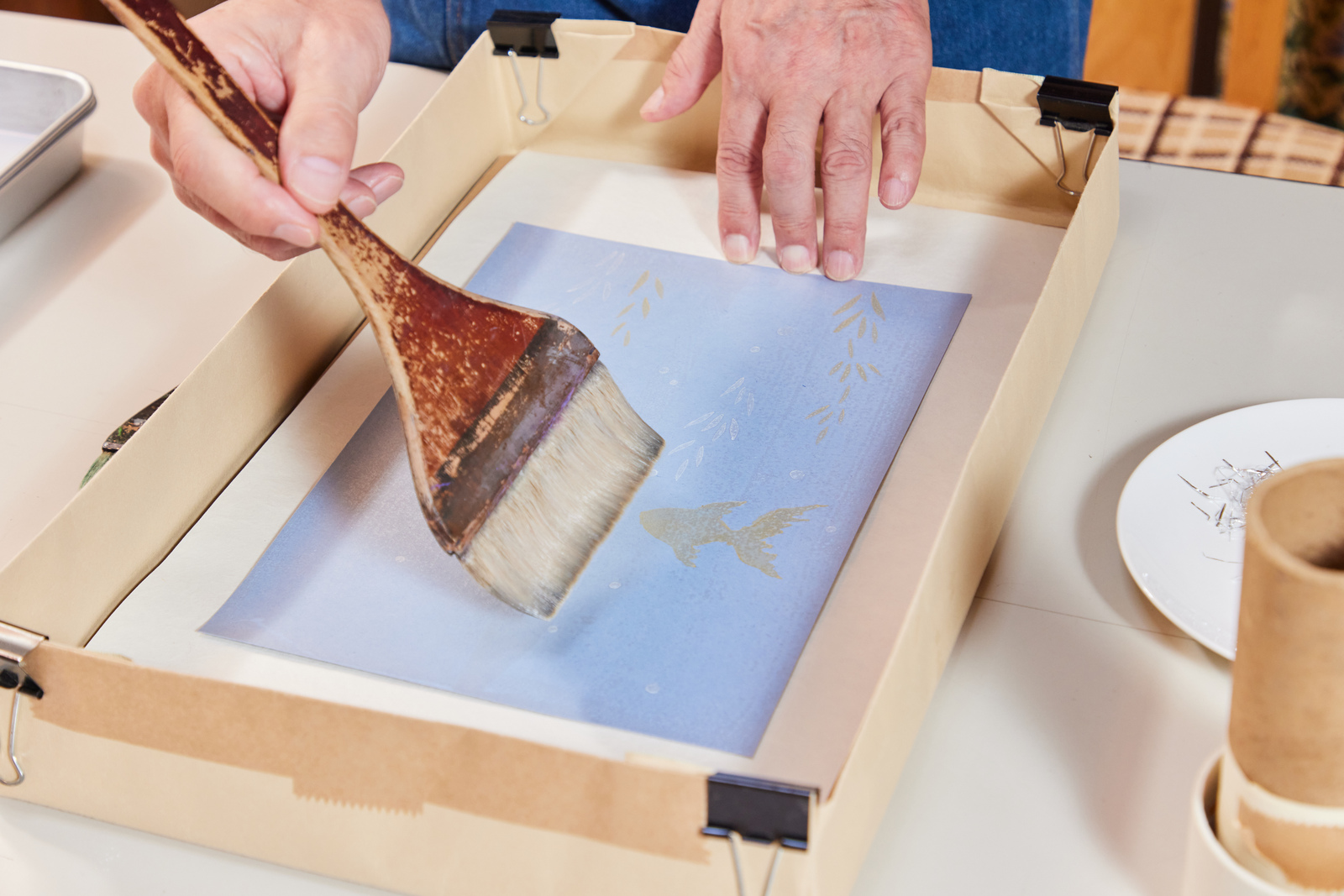 After making Kirihaku, it is time to start decorating the Karakami paper. To adhere the thin, lightweight kirihaku, you will apply a thin layer of adhesive to the surface of the Karakami paper. To prevent the paper from becoming too heavy after completion, it is ideal to apply the coating thinly and evenly at this step. To prevent the adhesive from drying before decoration begins, your skill in spreading the adhesive quickly will be put to the test.