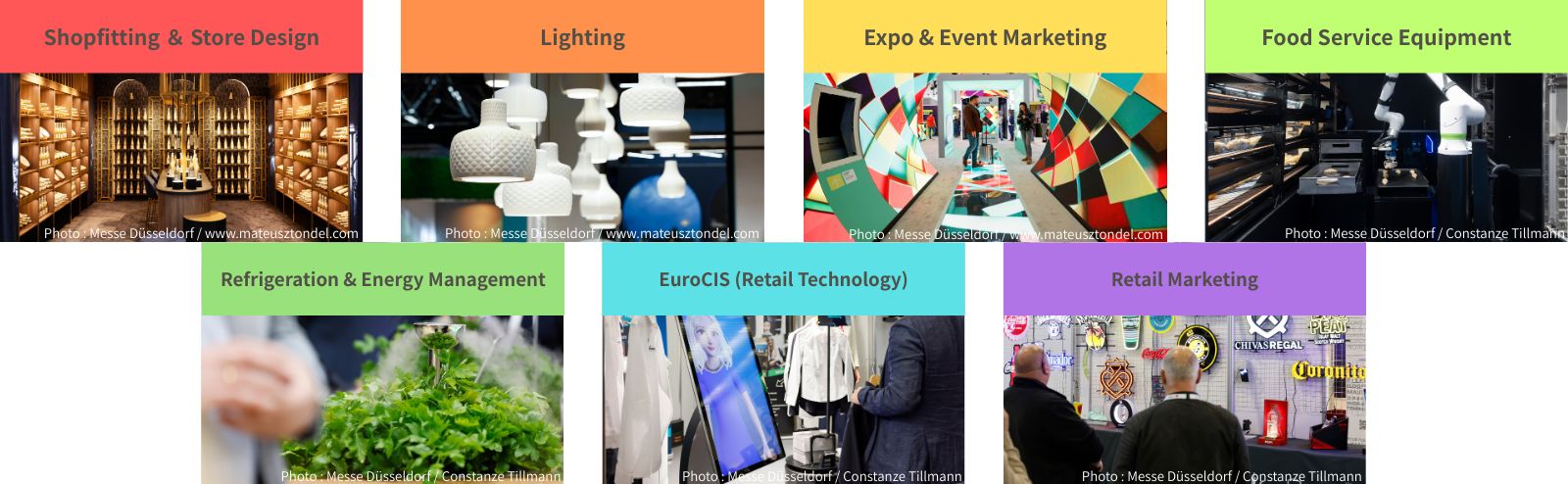 ・Shopfitting&Store Design:店舗マーケティング、ビジュアルマーチャンダイジング、資材 ・Lighting:照明管理、LEDランプなど ・Expo&Event Marketing:スタンド建設、コミュニケーションデザイン、装飾、デジタルソリューション ・Food Service Equipment:店内飲食に関わるサービス機器など ・Refrigeration & Energy Management:温度に関わる機器やエネルギー監視、空気衛星 ・EuroCIS (Retail Technology):オムニチャネル、ロボティクス、決済POSのソフトやハード ・Retail Marketing:デジタルマーケティング、サイネージディスプレイ、印刷 |
