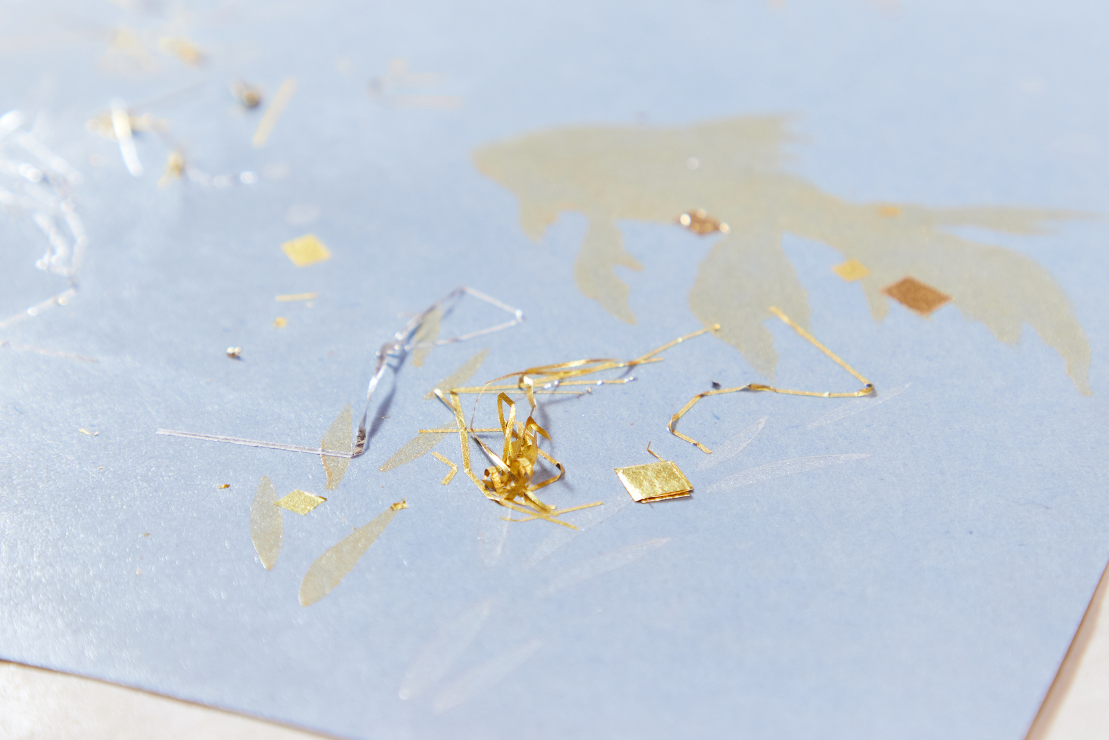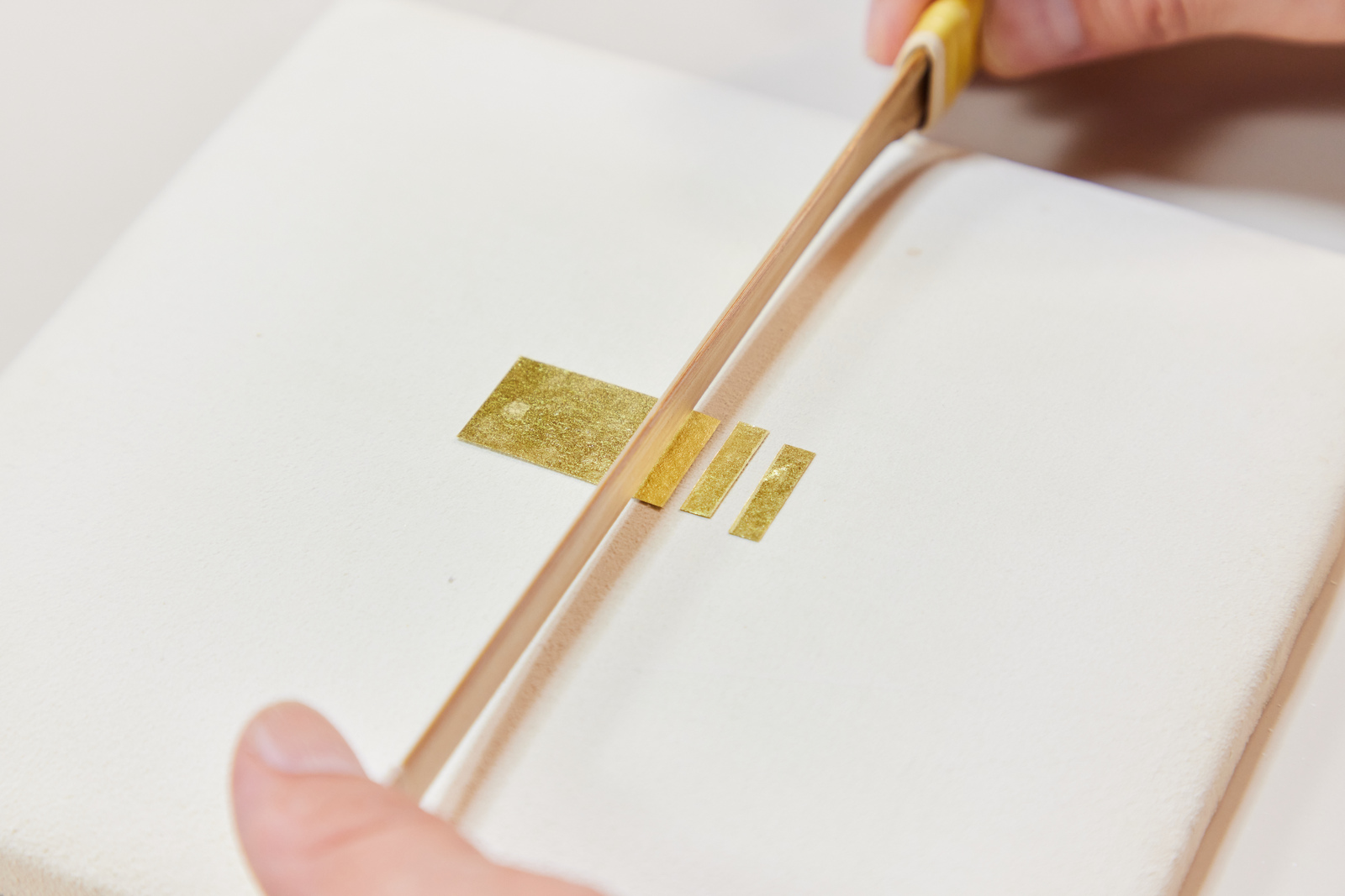 Next, it is time to create the Kirihaku cut gold leaf you will use in your decoration. The process of cutting large gold leaf sheets into small pieces is done entirely by hand. The processing of gold leaf that is said to be a mere 0.1 micron thin is not something that can be left to a machine. You will cut two kinds of Kirihaku, stones in a square shape and wild seaweed strands in a thin, string-like shape. To prevent the pieces and strands from being blown away by even the slightest airflow, it is advised to wear a mask and hold your breath while making slow, careful cuts.