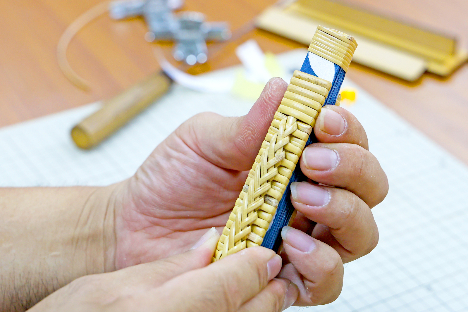 Next, you make a handle. Place some rattan for decorative weaving on a handle. From there, wrap the rattan around six times. On the seventh time around, pass it under the decorative rattan. Bind it tight, ensuring that there are no gaps. This wrapping technique provides the handle with a better grip, making it less likely to slip when held.