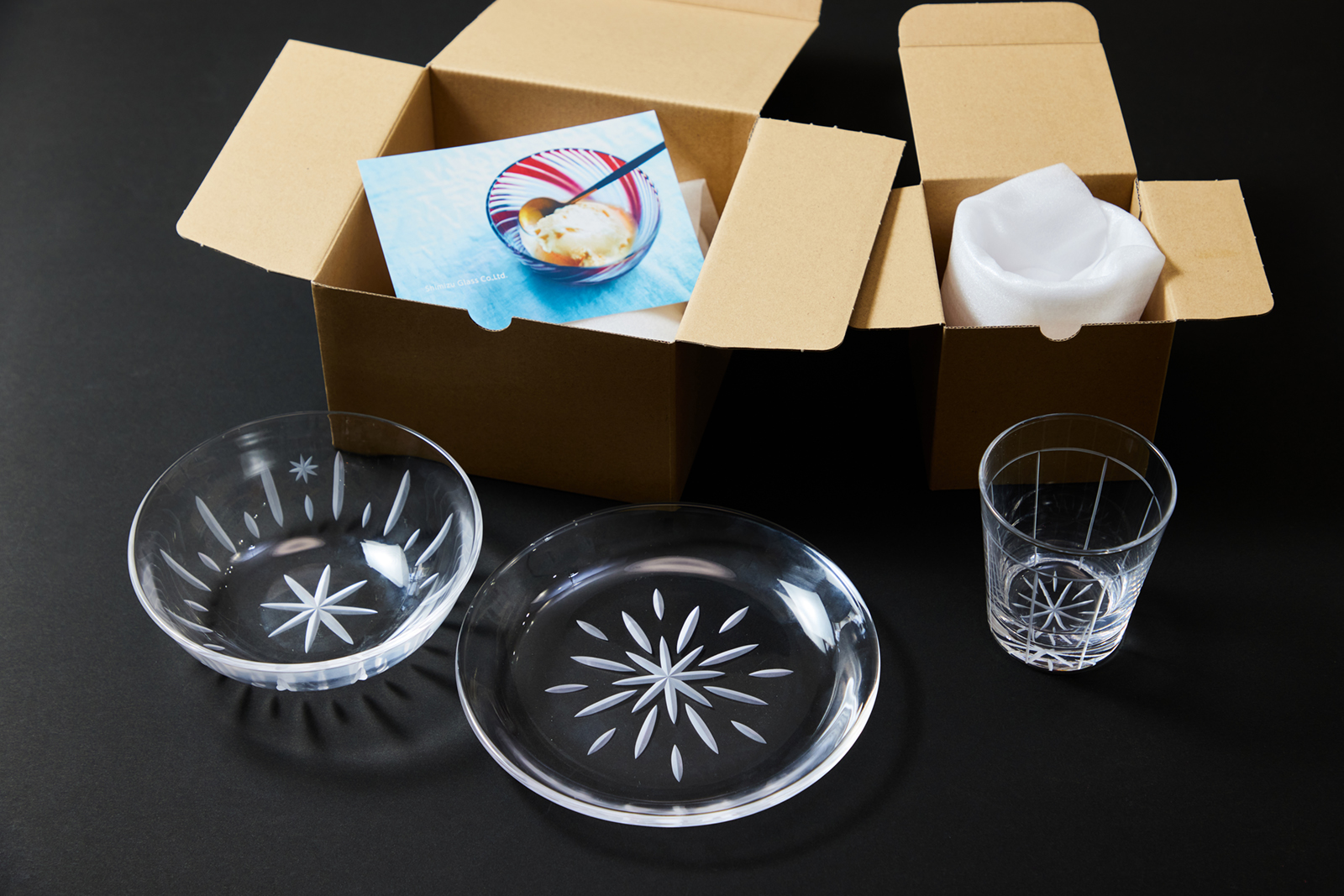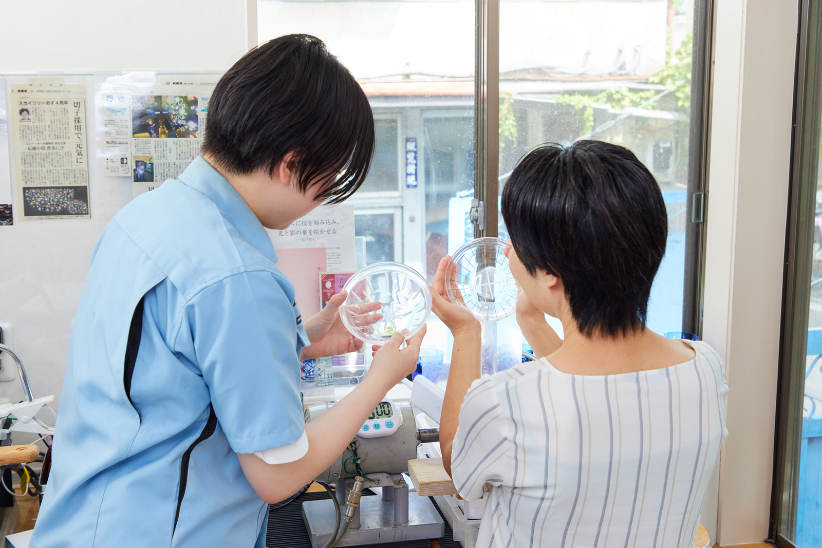 After a quick tour to the workshop , it is time to experience Edo Kiriko cut-glass crafting. For the tableware you will engrave with Kiriko cut-glass techniques, select one from the options of a tumbler, a salad bowl, or a flat plate. With an image in your mind of what the clear tableware will look like adorned with patterns, select one to take home after the activity.