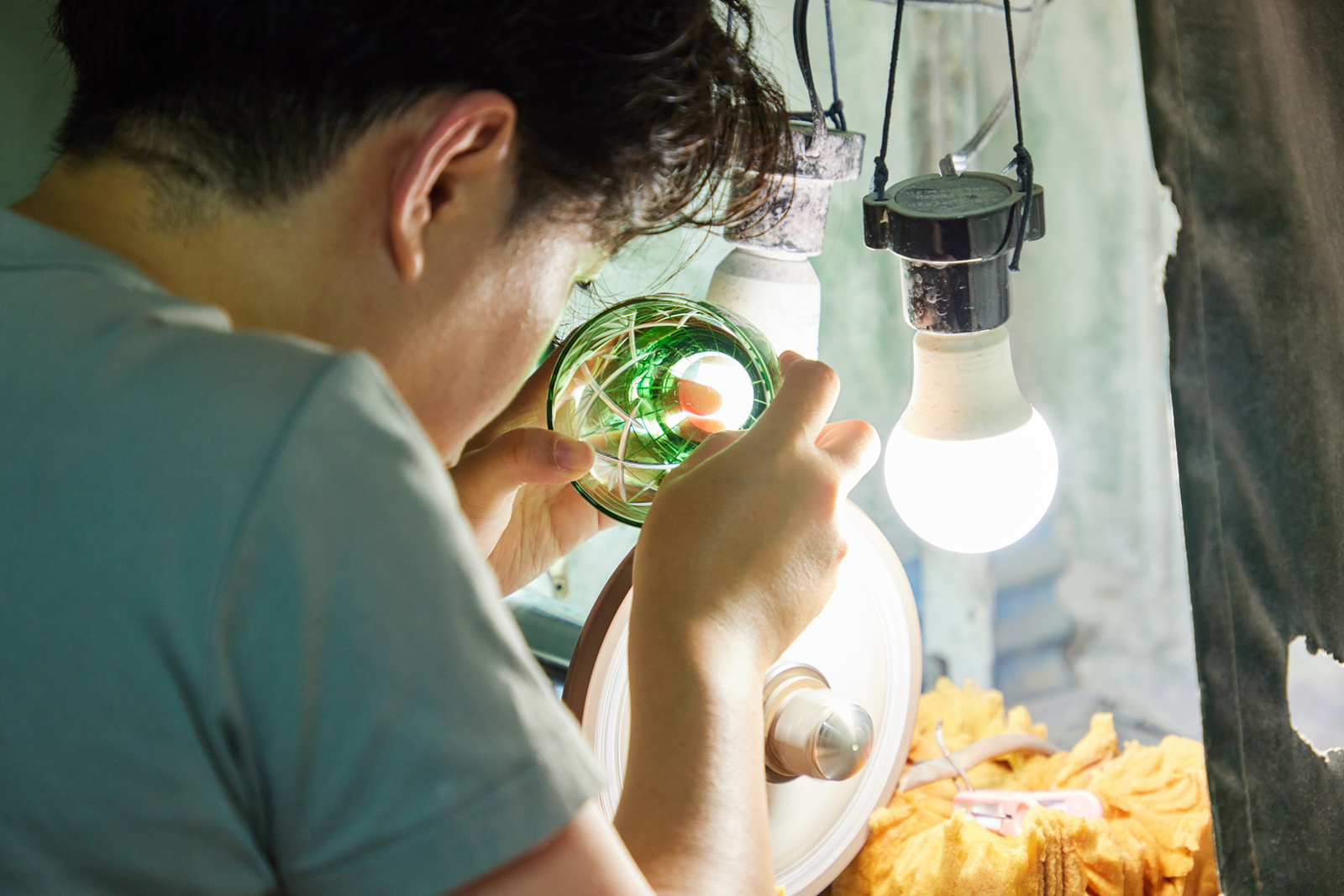 Shimizu Glass was established in 1923. Founded as a specialized glass processor, Shimizu Glass gained recognition for its advanced techniques and subsequently secured orders for glass tableware production from major tableware manufacturers. Subsequently, in 1994, Shimizu Glass started production of Edo Kiriko cut-glass to sell as its own products. Recently, it has been recognized for its advanced techniques across various fields, including glass decorations on the elevator walls and ticket counters of TOKYO SKYTREE.