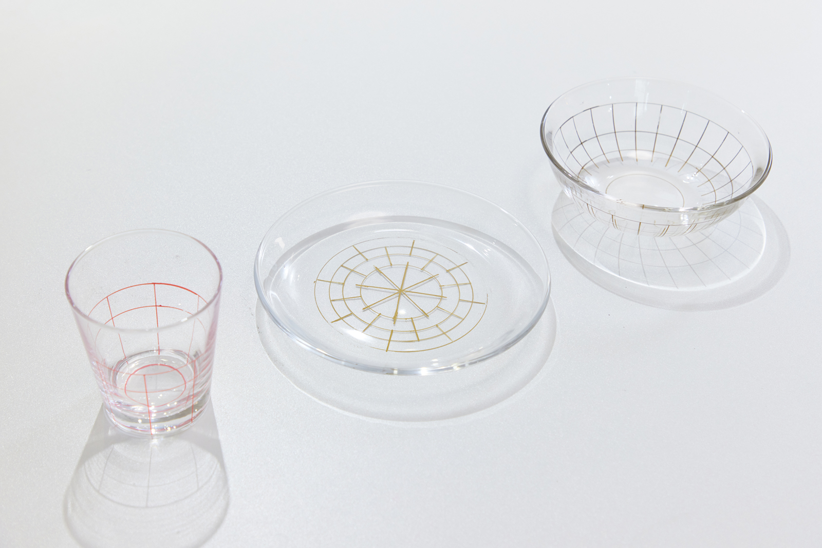 The tableware features lines drawn by artisans to indicate where kiriko engraving will be applied. The process of drawing lines, known as Waridashi, is one of the crucial steps that determines the beauty of Kiriko cut-glass. The symmetrically balanced lines reveal the dedication and high level of technique cultivated by our staff over time.