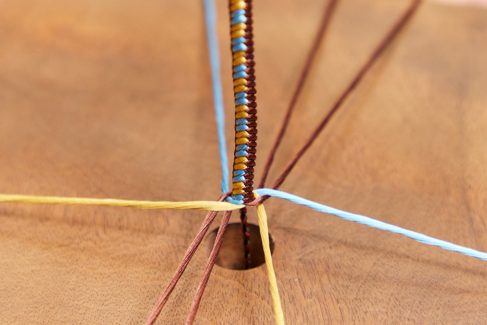 The weight at the end of each thread is referred to as a “ball.” Feel their gentle heaviness as you rhythmically move the threads diagonally. Move the rear thread to the left, and the front thread to the right. Each time two threads are moved symmetrically, the cord is slowly and gradually woven together. At first, it may be hard to get the hang of how to move the threads, so you might be cautious in your movements. But that self-doubt only lasts for a little bit. When you notice that all you are hearing is the gentle sound of the balls clacking, you will be moving your hands without conscious thought.