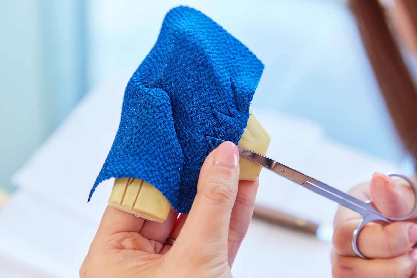 The mold for the doll you’ll use during the experience already has the necessary grooves cut into it. First you’ll spread a thin layer of glue over the area to be covered with cloth and with a bamboo skewer fill in the grooves. Then it’s time to start the Kimekomi process. Placing the cloth along the groove, you press it in with a small metal spatula. While inserting it in slowly and carefully, the glue will dry out as time passes. So try doing it with speed and precision, it’s your time to shine! The cloth slides in smoothly, so there’s no need to force it. We recommend you work rhythmically and quickly.
