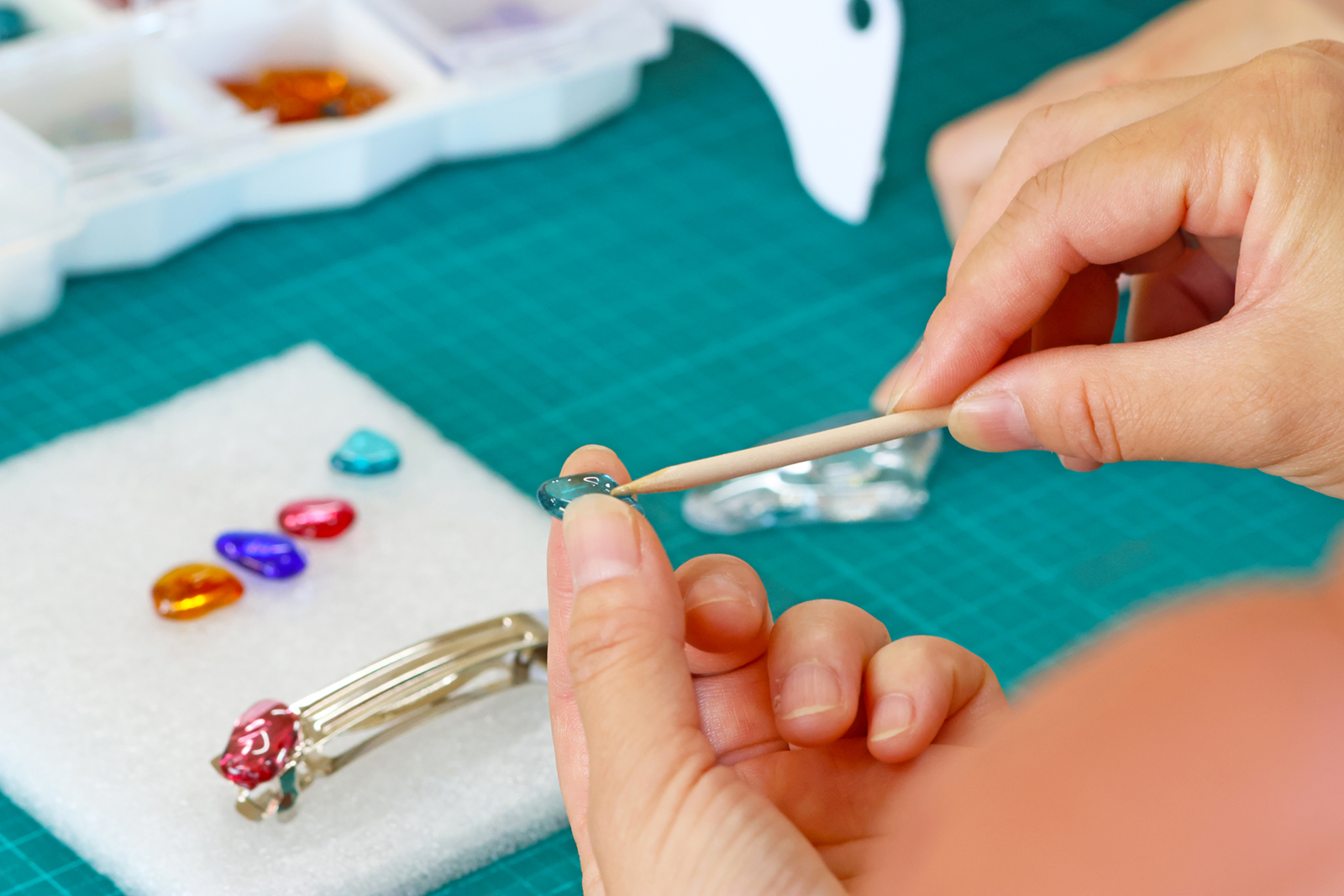 Place your recycled glass pieces with colors and shapes that you like onto the hair pin or necktie pin base you selected. The key is to not affix the pieces immediately. Instead, place the recycled glass on the base to get an idea of what your finished piece will look like. Once you've decided on the design, use a bamboo skewer to apply resin (adhesive resin) to the recycled glass pieces and attach them to the base. Once all the glass pieces are attached to the base, the accessory is complete.