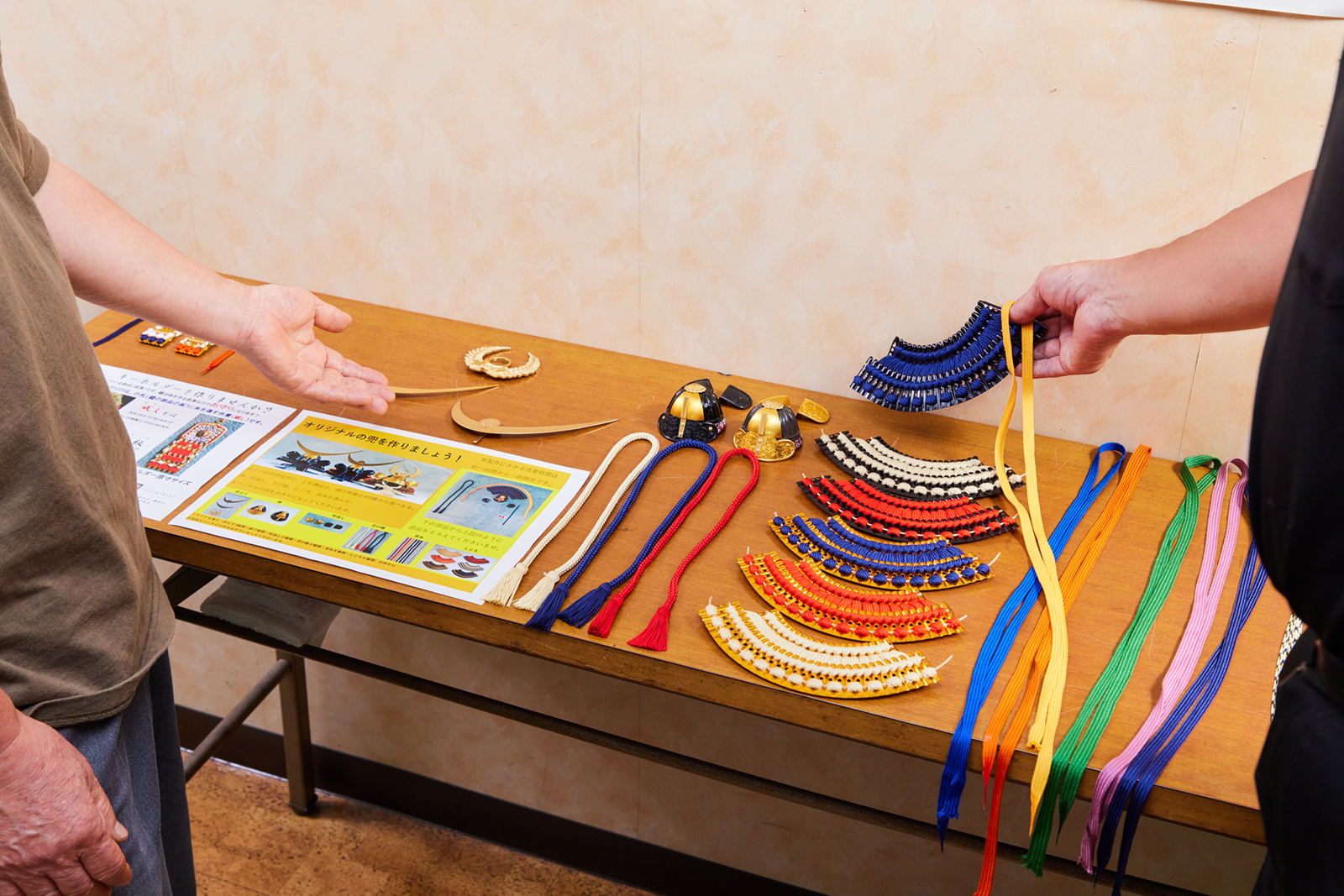 Next comes the main part of this activity: Samurai helmet crafting. There are six parts that make up a miniature helmet modeled after a real Sengoku period (Warring States period) helmet: Maedate (crest), Hachi (bowl), Fukigaeshi (side flaps), Shinobi-no-O (chin cord), Mimi-Ito (ear cord), and Shikoro (side neck guard). Select your colors and design components from options like Maedate of Tokugawa-Ieyasu, Date-Masamune, or Uesugi- Kenshin. There are 1,768 possible combinations of colors and shapes for each part. Choose a unique combination that must be exciting to you, whether it's a design inspired by your ideal military commander or your favorite color scheme.