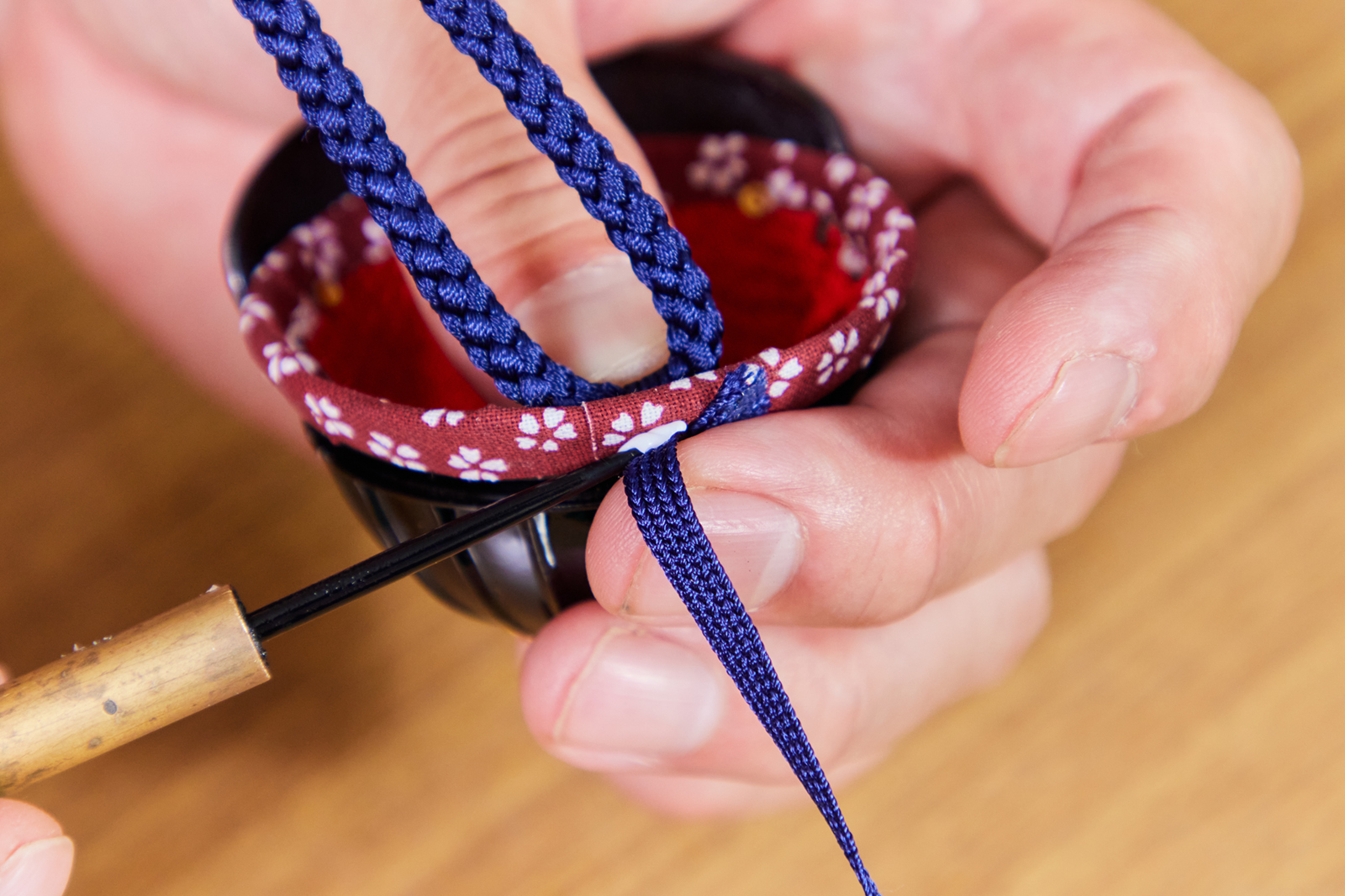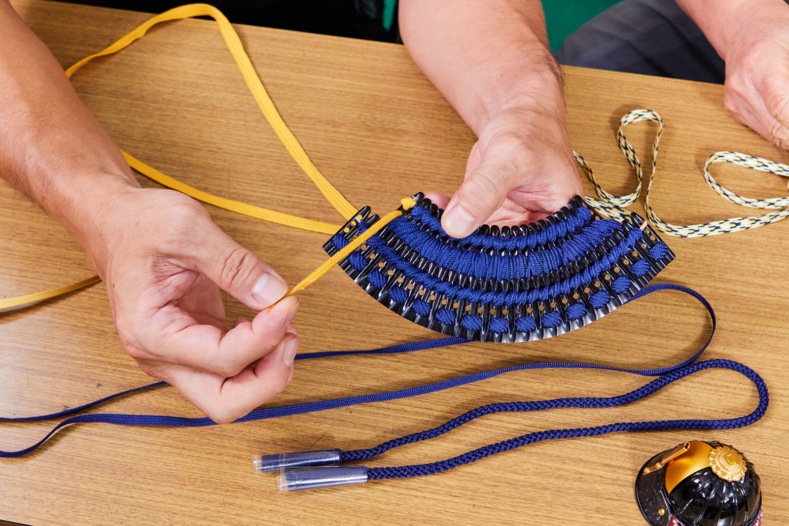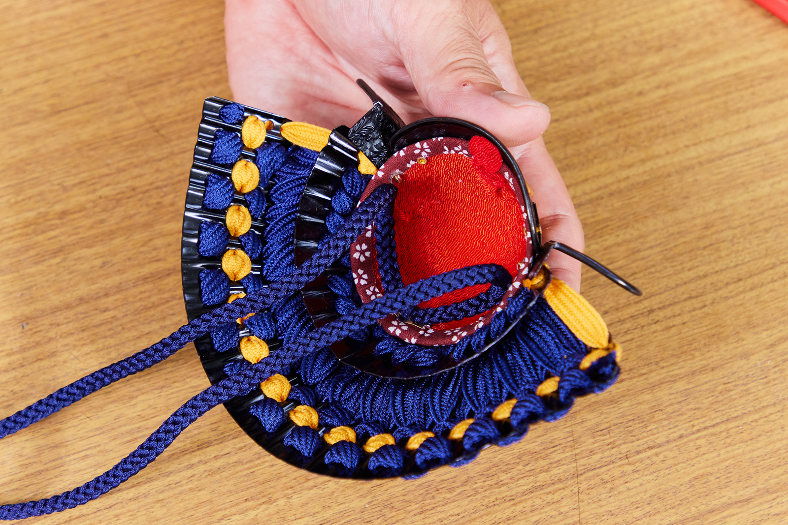 After threading Mimi-Ito through Shikoro, it is time to connect each part together. After securing Shinobi-no-O to Hachi that covers the head to fix the helmet in place, and combining Maedate, Fukigaeshi, and Shikoro, finally tie Shinobi-no-O to complete the assembly. The knot used for Shinobi-no-O is called Agemaki-knot, said to have the meaning of warding off evil spirits and misfortune. Make a wish for your family’s health while you carefully craft a beautiful knot, so it will not come undone easily.