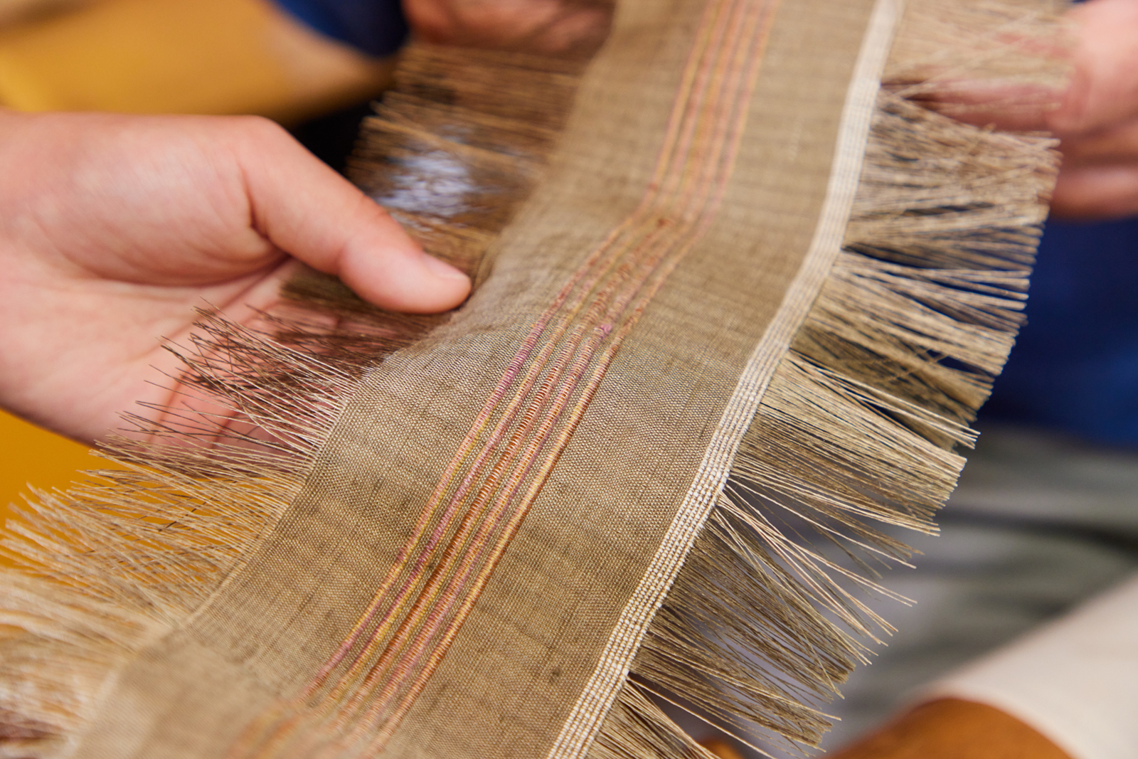 After moving to the workshop, it’s time to start weaving. First, you sit at a 2.5 m long wooden loom and ensure your hands and feet are placed correctly. You may be surprised by how much goes into working the thread and the loom with your whole body.