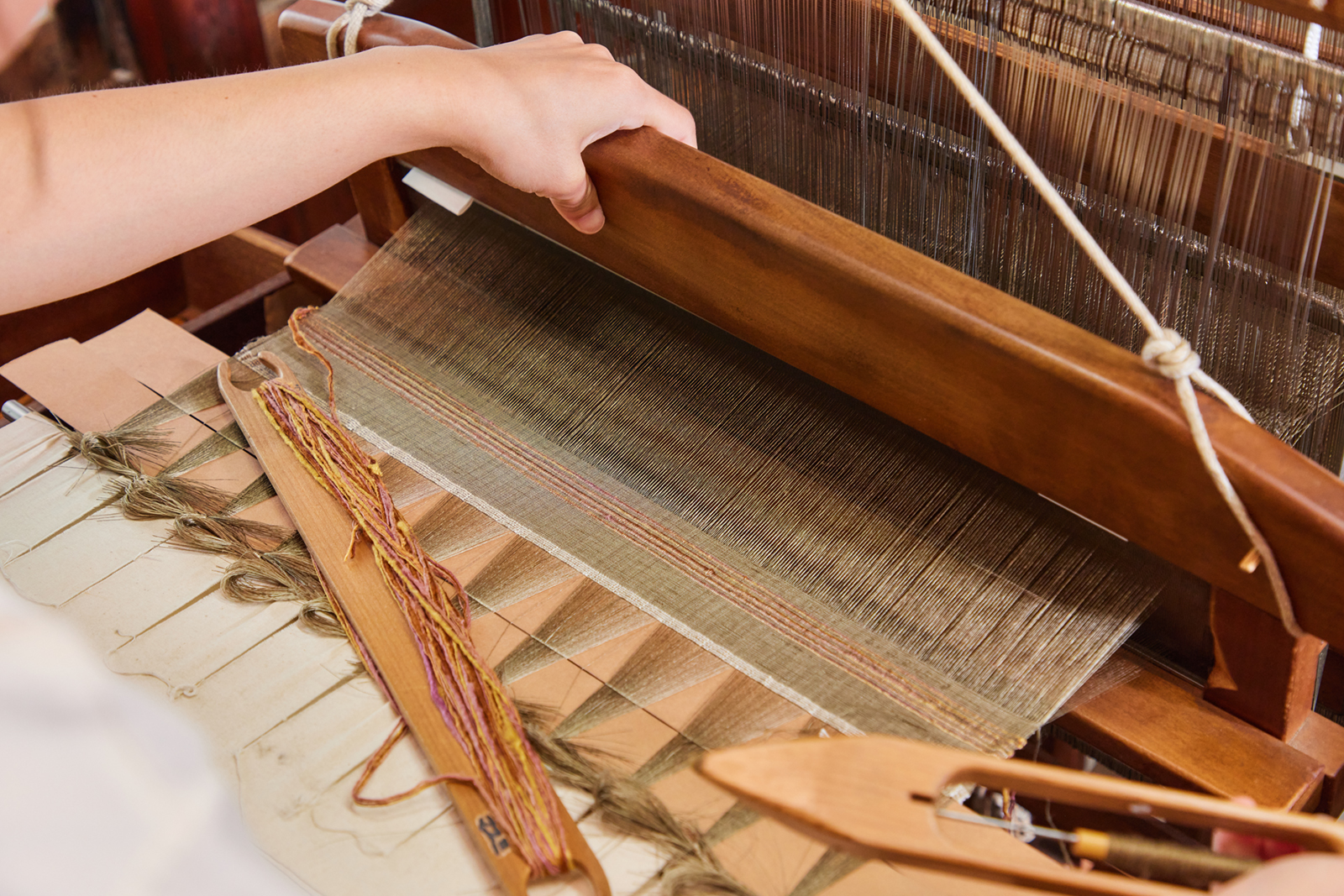 The weaving process can be roughly divided into three steps. You pass the shuttle carrying the weft thread between the upper and lower warp threads, press the foot pedal to switch their position, and then slide the reed forward to tighten the weave. As you switch and tighten, the loom will make its own rhythmic sound. As you switch and tighten, the loom will make its own rhythmic sound. At first, the shuttle will likely to move slowly, but you’ll get faster as you work. By the time you get used to the rhythm of the footwork and the sound of the passing reed, a beautiful fabric will begin to emerge.