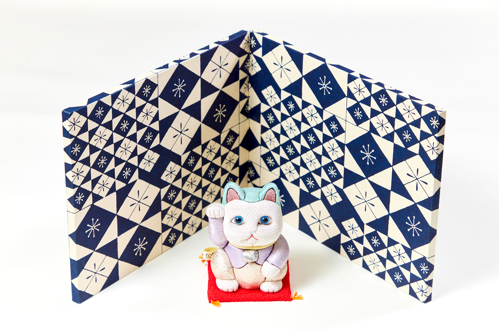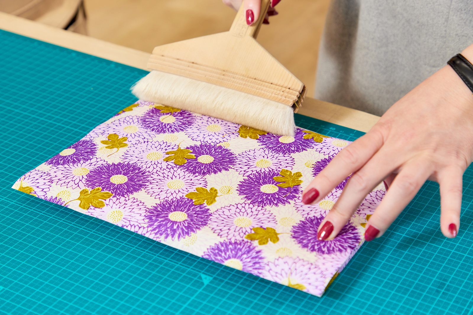 Flip the panel over and repeat the same process on the reverse side. Lastly, affix the Japanese paper with designs to both sides. To prevent air pockets, move the brush from the inside outwards in a stroking motion. The completed mini folding screen is an art piece that blends beautiful Japanese patterns with traditional techniques. Arrange it around your favorite dolls and knickknacks, and it will create an even brighter, more vibrant space.
