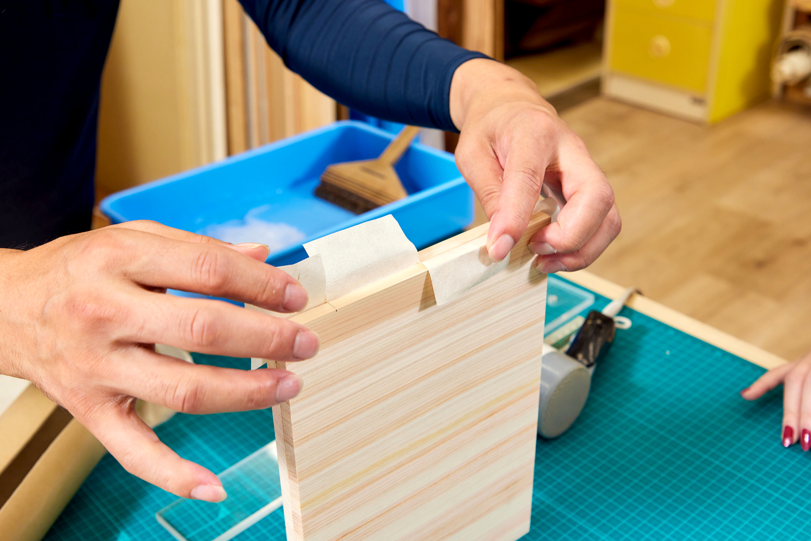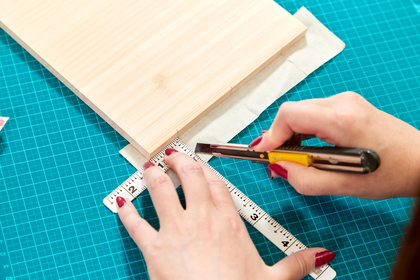 Now, it is time to start your crafting. First comes preparing the panels that will be the body of your folding screen. First, attach narrow strips of Japanese paper to the sides of the B5-sized wooden panels to connect them together. Following the instructions from the artisan, trim off the excess with a craft knife. With the cut Japanese paper, adhere with glue so that the two panels cover each other. After joining the panels together with Japanese paper, cover the joints with more Japanese paper to conceal them. At this point, it may be difficult to imagine the purpose behind this process of connecting the two panels. But, a surprise that will amaze you waits just around the corner.