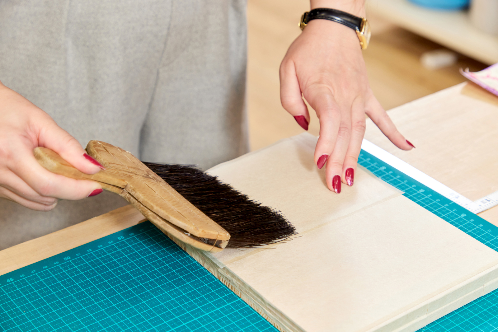 The surface of the two connected panels is still bare wood. Apply a thin layer of Japanese paper as a base to ensure the design you chose at the beginning will go on nicely. The adhesive is Shofu-glue, which is made from starch. Apply the glue thinly, evenly, and quickly to prevent any areas where it dries unevenly and fails to bond. Once you've finished spreading the glue, place a thin sheet of Japanese paper on the adhesive surface. The key to achieving a beautiful finish is to skillfully use the brush and your hands, pressing down carefully.