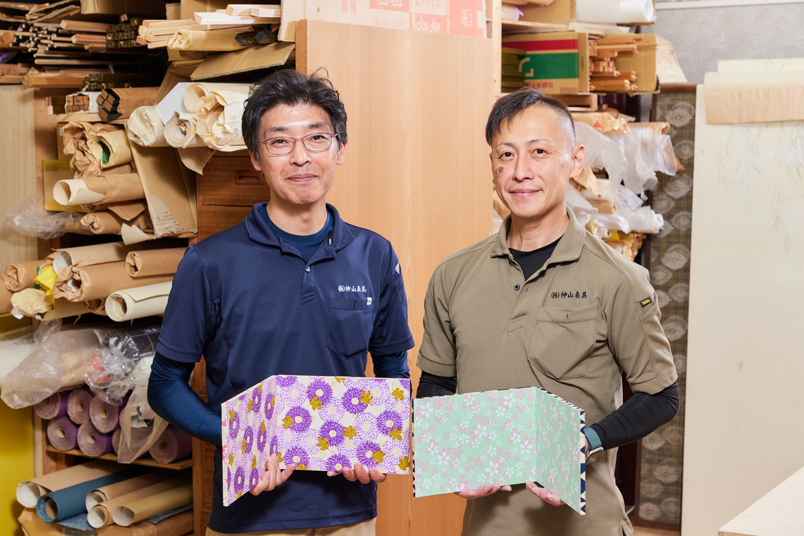 Founded in Ota-ku, Tokyo around 1940. The shop provides a wide array of hyogu mounting services, from mounting surfaces on opaque Fusuma sliding doors and translucent Shoji sliding doors for Japanese households to assembling traditional decorations such as folding screens and hanging scrolls. From around 1950, the company expanded into interior design work such as wallpaper using Japanese paper and installing flooring and tiles. It is renowned for its high technical skill requiring multiple wallpaper and mounting specialists. Through traditional Hyogo mounting craftsmanship and meticulous interior design work, Kamiyama Hyougu supports the lifestyles of local people.